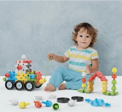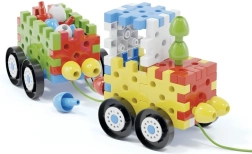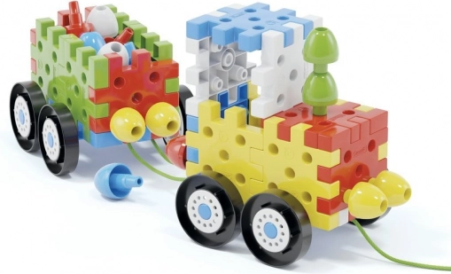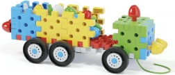 Byg biler, huse og træer af brikker og pinde! Dette innovative byggesæt indeholder flade 3D-brikker, der kan forbindes indbyrdes, samt store pinde i forskellige farver, så selv små børn kan samle forskellige biler, huse, tårne, træer og meget mere. Blandt de i alt 62 elementer er der også 8 hjul til bilernes undervogne og 3 snore, som bilerne kan trækkes med. Ud over forskellige biler gør byggesættet det muligt at skabe både plane og tredimensionelle strukturer, hvilket for børn fra 2 til 6 år træner og udvikler finmotorik, hånd-øje-koordination og rumlig orientering samt understøtter deres kognitive udvikling. Indhold i pakken: 20 flade 3D-brikker, der kan forbindes indbyrdes; 16 sammenkoblingsbare pinde; 8 hjul; 3 snore til at trække bilerne. Hovedegenskaber: udvikler finmotorik, kreativitet, fantasi og logisk-kombinatorisk tænkning; pakken indeholder 52 brikker; til børn fra 2 år.