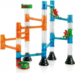 Pakken indeholder 45 dele lavet af gennemsigtig og farvet plast i en kombination af orange, blå og grøn. Velegnet til børn fra 4 år, banen tilbyder uendelige muligheder for opbygning. Pakningsmål: 34x29x7 cm.