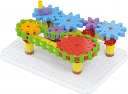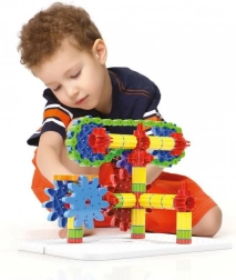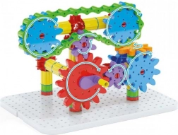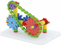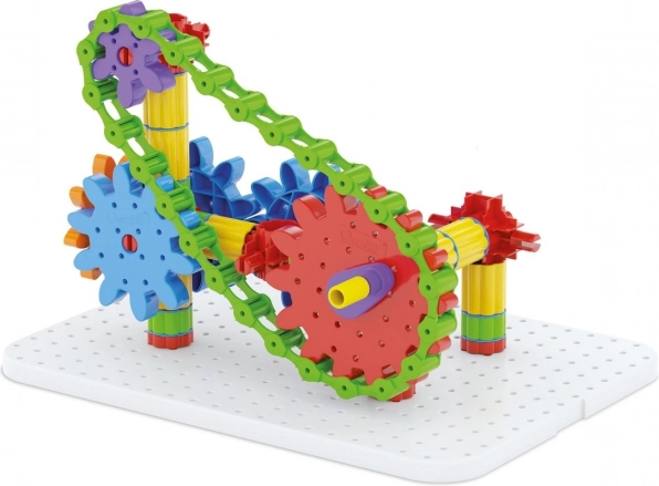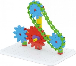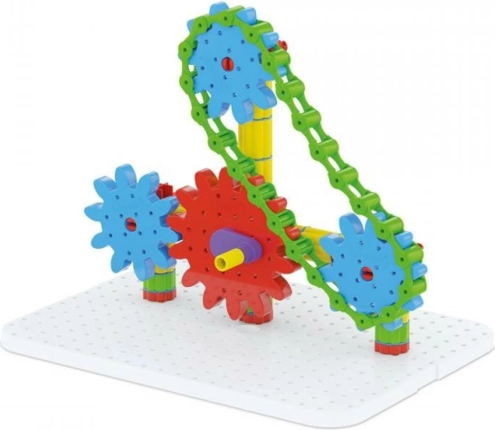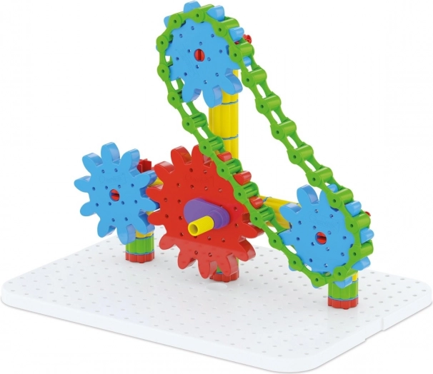 Byggesættet er lavet af holdbar plastik og er beregnet til børn fra 5 år. Det indeholder komponenter som en hvid grundplade, tandhjul i forskellige størrelser, kæde og meget mere, hvilket giver børn mulighed for at opdage en ny verden af mekaniske bevægelser.
