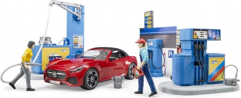 Komplet legesæt til små bilentusiaster: tankstation, funktionel vaskehal, sportsvogn og to figurer. Nyd realistisk betjening, tankning, vask med vand og forfriskninger i snackshoppen. Bilen har aftagelige hjul og tag og er kompatibel med BRUDER BWORLD. Fremstillet i Tyskland af kvalitetsplast.