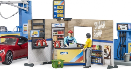 Denne detaljerede BRUDER tankstation giver børn realistisk leg i timevis. Sættet indeholder standere, kasseområde med snackshop, funktionel vand-vaskehal og masser af tilbehør. Med to figurer kan børn let lege både kunde og medarbejder.