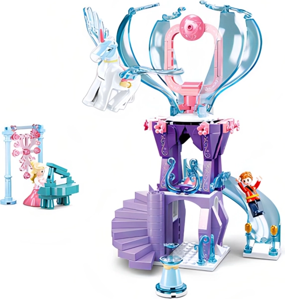 Byggesættet indeholder et smukt lilla-blåt tårn med funktionelle elementer som en rutsjebane og trappe.