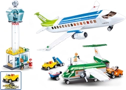 Byg en komplet lufthavn med et stort passagerfly, et mindre fly, kontroltårn og rullende servicekøretøjer. Ideelt til leg med flytrafik.