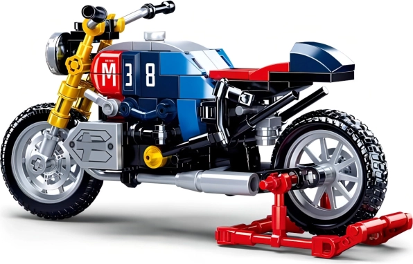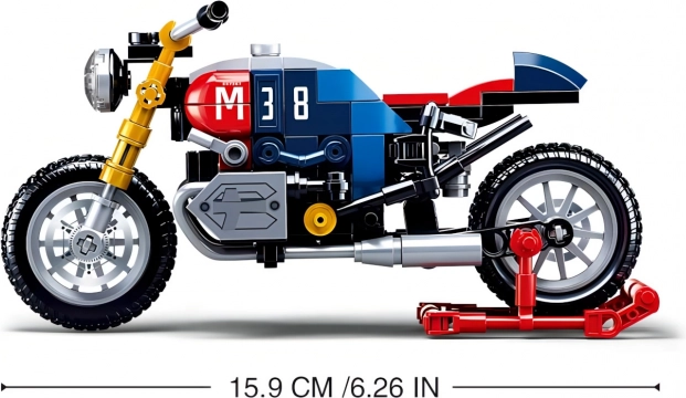 Denne detaljerede motorcykelmodel i ikonisk café racer-stil tilbyder en iøjnefaldende kombination af blå, rød og gul med det markante nummer 38. Realistiske elementer som funktionelle hjul og udstødninger gør den til et attraktivt motorcykel-byggesæt til både leg og udstilling.