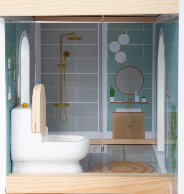 Stilfuldt trædukkehus med åben front, der tilbyder tre rum, terrasse og lille have for realistisk leg. Inkluderer spiraltrappe, åbnebare vinduer, moderne badeværelse med plexivæg og 8 stk. funktionelle møbler med tekstiltilbehør. Det kompakte og stabile design i lys, moderne stil passer perfekt i både børneværelse og stue.