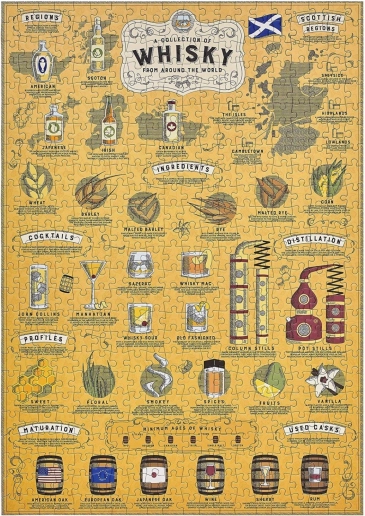 Oplev glæden ved at lægge puslespil med dette unikke sæt, som er perfekt til whisky-elskere. Det indeholder en samling af whiskyregioner, smagsnoter og cocktails, hvilket gør det til et ideelt gavevalg.