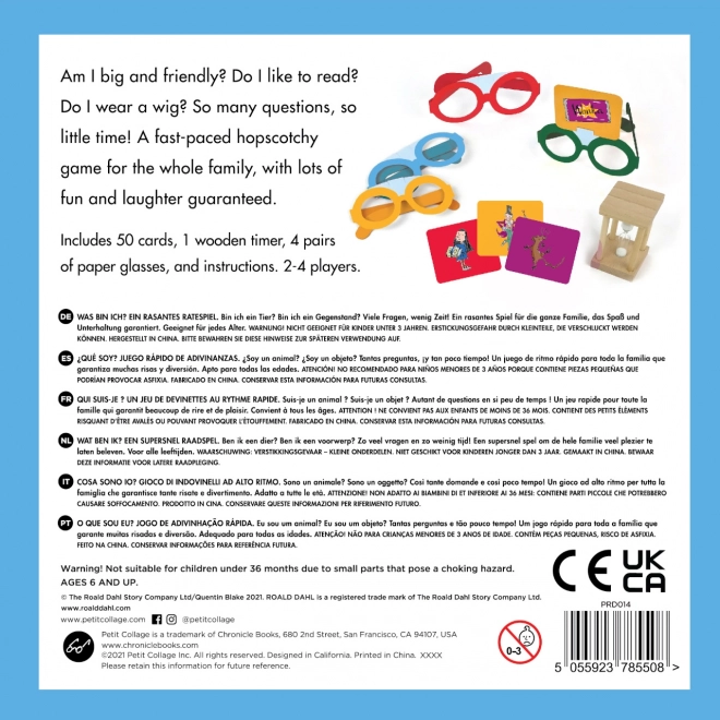 "Hvad er det? Et spil med temaer af Roald Dahl" fra Petit Collage trækker dig ind i den magiske verden af litterære figurer med sjove briller og illustrerede kort. I dette underholdende spil kan spillere teste deres viden om populære figurer gennem spørgsmål og svar. Spillet er designet til 2-4 spillere og er ideelt til hyggelige familieøjeblikke.