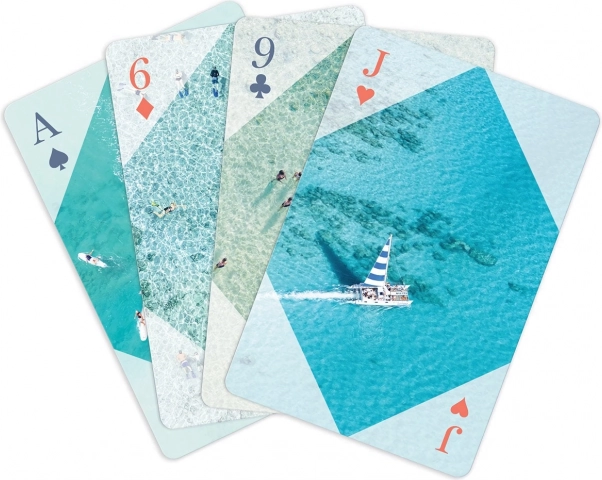 Nyd en unik oplevelse med kortspil med dette stilfulde sæt, der kombinerer traditionelle spillelementer med fortryllende luftfotos af strande. Sættet indeholder to sæt af 54 kort, i alt 108 kort.