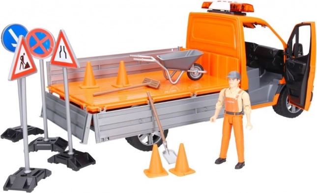 For endnu større realisme er køretøjet udstyret med blinklys med lys- og lydeffekter (batterier medfølger). I pakken finder du også en vejarbejder‑figur med bevægelige lemmer, færdselsskilte, kegler, ramper og værktøj. Den robuste konstruktion af ABS‑plast tåler intensiv leg både inde og ude.
