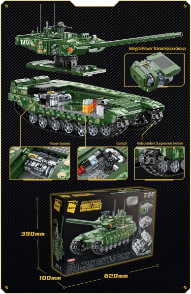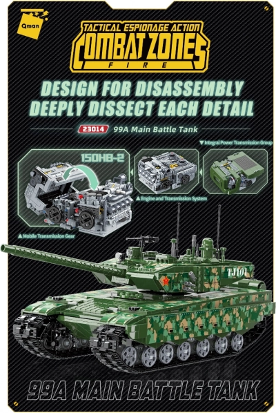 Byg den ikoniske kinesiske kampvogn 99A af 2.743 klodser og udforsk dens hemmeligheder takket være en let tilgængelig kabine, fuldt roterende tårn og uafhængigt affjedret undervogn. Et unikum er den store model af drivaggregatet 150HB-2, som gør det muligt at studere konstruktionsdetaljer. Qman-byggesættet er kompatibelt med andre mærker og lavet af holdbar ABS-plast.