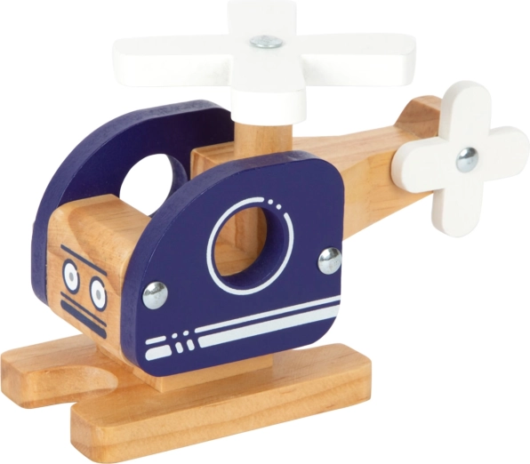 Træhelikopteren har en naturlig træfinish med blå og hvide detaljer, hvilket giver den et legende udseende og gør det sikkert for børn.