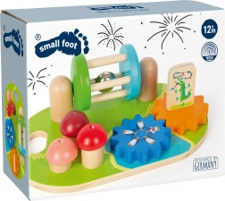 Den træplade byder på forskellige bevægelige elementer som tandhjul og knopper, der udvikler finmotorikken.