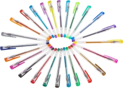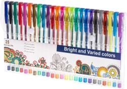 Dette alsidige sæt gelpenne er ideelt til børn, studerende og voksne. Det indeholder 25 nøje udvalgte dele: 12 glitrende til effektfuld pynt, 7 metalliske til stilfulde accenter, 3 fluorescerende til tydelig fremhævning og 3 klassiske farver (sort, blå, rød) til hverdagsskrivning. Det transparente hylster gør det let at se blækniveauet, og den fine spids sikrer præcise linjer.