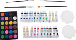 Palette med 24 akvarelfarver, 24 tubefarver, pensler og to plastikpaletter – komplet udstyr til både transparente og dækkende teknikker.