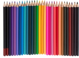 Farveblyanter, oliepasteller, blyanter, viskelæder og blyantspidser til præcis tegning, skyggevirkninger og markante farveflader.