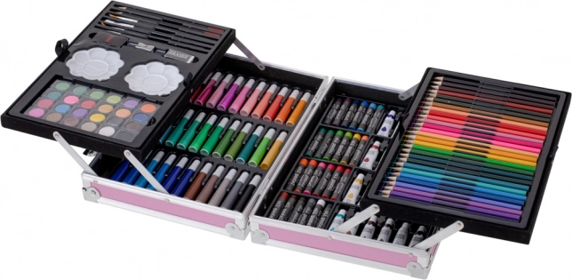 Dette alsidige sæt rummer op til 145 dele, så du kan skabe billeder med mange teknikker: tegning med blyant og farveblyanter, maling med akvarel og dækkende tubefarver, farverige illustrationer med tuscher eller arbejde med oliepasteller. Alt er overskueligt organiseret i en robust kuffert med låse og håndtag, så du nemt kan tage udstyret med overalt.