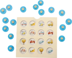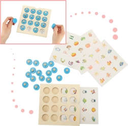 Træbaseret hukommelsesspil er et fremragende valg, der kombinerer sjov og læring. Spillet har enkle regler, som selv små børn let forstår. Vælg et kort, husk placeringen af de forskellige former, og dæk dem med de blå låg. Vend derefter to ad gangen og find de matchende par!