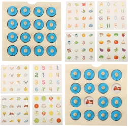 Trælegetøj til læring med aftagelige pinde og billeder med tal. Hjælper børn med at lære tal og udvikle finmotorik ved at matche pinde med de tilsvarende billeder.