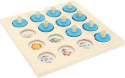 Træspilleplade med plastbrikker dekoreret med billeder af astronauter, raketter og planeter. Fungerer som legetøj med læringseffekt til at udvikle hukommelse og kognitive færdigheder.