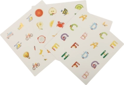 Sæt med læringskort med farverige bogstaver og tilsvarende illustrationer. Hjælper med at lære og genkende alfabetet på en sjov og interaktiv måde.
