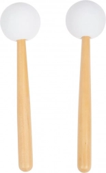 To trommestikker med hvide kugleformede hoveder giver en blød, ren tone, som er skånsom mod børns ører og understøtter længere spilletid uden støj.