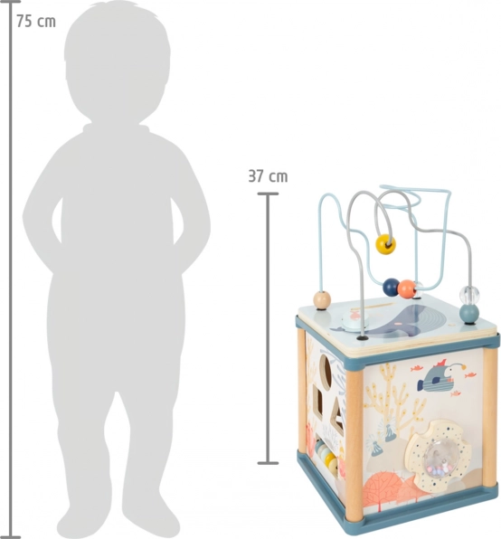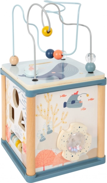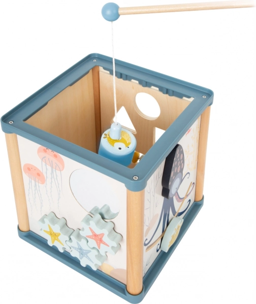 Denne træ-aktivitetskube med undervandstema tilbyder fem sider fulde af aktiviteter samt sjovt magnetisk fiskeri – delene fra puttekassen kan fanges med den magnetiske fiskestang direkte inde i kuben. Farverige illustrationer af havdyr understøtter den visuelle perception, og den elastiske blæksprutte tilføjer et legende element, som motiverer børn til at udforske videre.