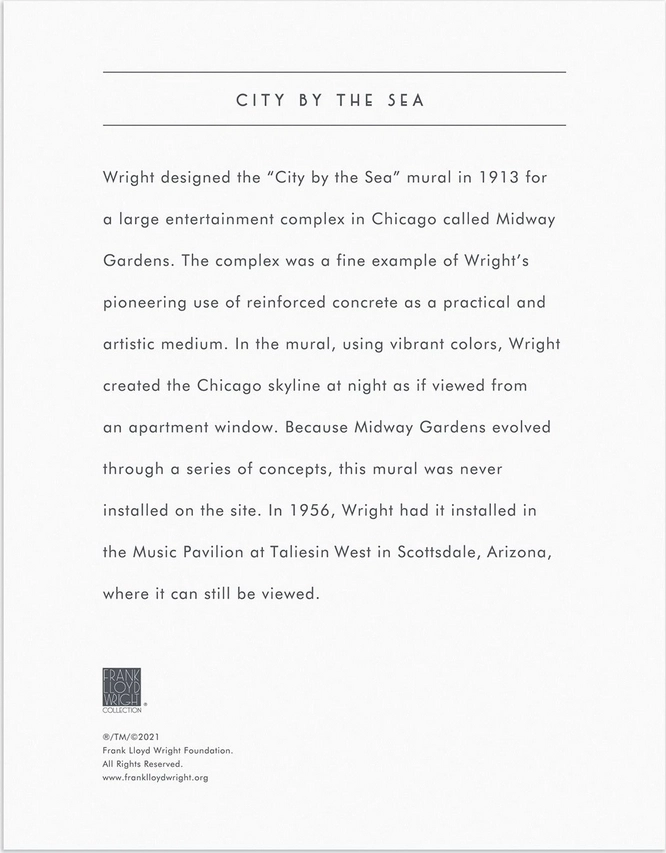 Dette smukke puslespil bringer Frank Lloyd Wrights ikoniske kunst ind i dit hjem. Vægmaleriet “City by the Sea” blev designet i 1913 til et underholdningskompleks i Chicago og betragtes som et banebrydende eksempel på anvendelsen af armeret beton i kunsten. Puslespillet gengiver dette maleri set gennem et lejlighedsvindue og indeholder detaljer fremhævet med folie, hvilket giver et nyt perspektiv på dette ikoniske værk.