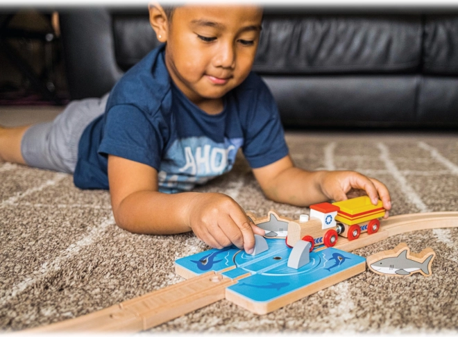 Hvirvel med hajer forvandler enhver trætojbane til en spændende havmission. Børn styrer den roterende sporsektion og beslutter, om toget sikkert passerer forbi hajfinnerne. Dette legeelement tilfører spænding, historier og aktiv involvering.