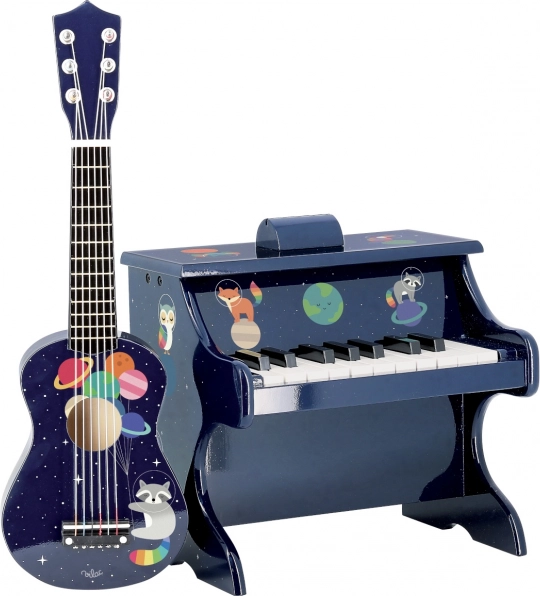 Vi præsenterer Rumguitaren, det ideelle instrument for små musikere og elskere af rumrejser. Denne børneguitar er lavet af træ, hvilket garanterer kvalitet og holdbarhed. Dens design er beriget med farverige planetmotiver og illustrationer af en vaskebjørn astronom, hvilket gør det til et sandt drømmelegetøj.