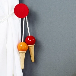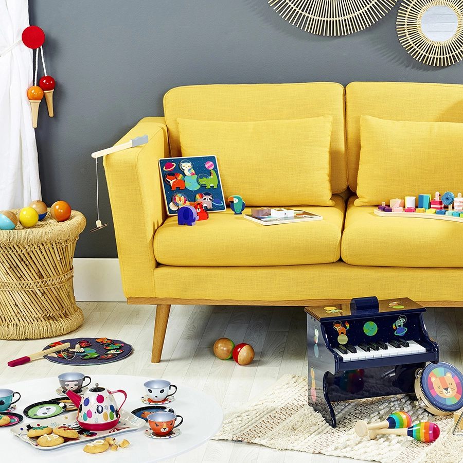 Traditionelt fransk håndværk sikrer præcis udførelse og lang holdbarhed. De farverige “kugler” på enderne af håndtagene gør hver leg stilfuld og motiverer børn til at røre sig.