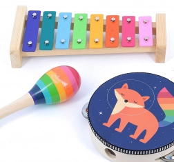 Sættet indeholder xylofon, tamburin, triangel og maracas, hvilket gør det til et fremragende læringsværktøj til at udvikle børns musikalske færdigheder og rytmesans.
