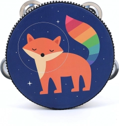 Tamburinen er udsmykket med en sød illustration af en ræv med regnbuehale på blå baggrund, hvilket giver børn en munter måde at skabe musik på.