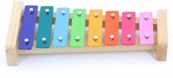 Xylofon med regnbuefarvede metal-tangenter på en træbase. Hver tangent er markeret med en node, hvilket gør det nemmere at lære musik.