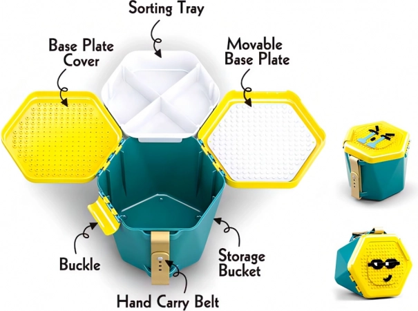 - Praktisk spand – låget fungerer som byggeplade, og indeni er der et rum til overskuelig sortering af dele.