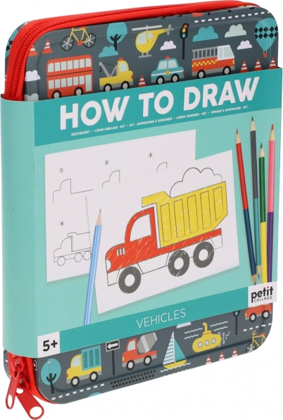 Opdag det kreative sæt fra Petit Collage, hvor børn fra 5 år lærer at tegne 36 køretøjer trin for trin – fra cykler og biler til balloner og både. Et praktisk metaletui med lynlås rummer alt, hvad der behøves på farten: tegneunderlag, 4 dobbeltsidede farveblyanter og en blyant med viskelæder. Produktet er ikke-giftigt og opfylder sikkerhedsstandarder.