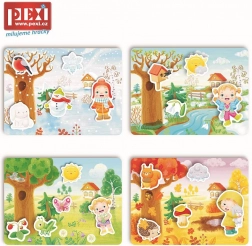 Hvornår laver du snebolde? Hvornår kan du gå i skoven for at samle bær og svampe? Sættet indeholder 4 store, fleksible plastplader med velcro og 20 separate brikker, som du fastgør på pladerne med velcro. Takket være denne smarte løsning falder de enkelte dele ikke så let af og bliver siddende på den rigtige plads.