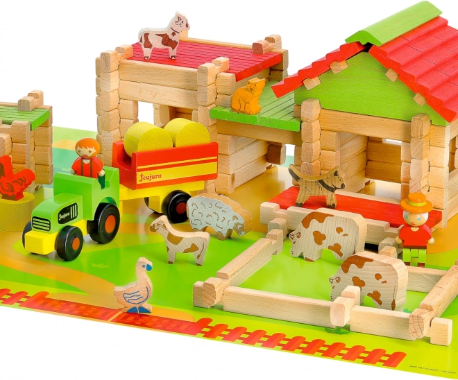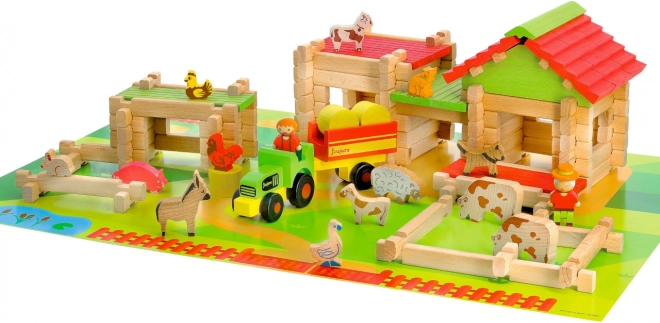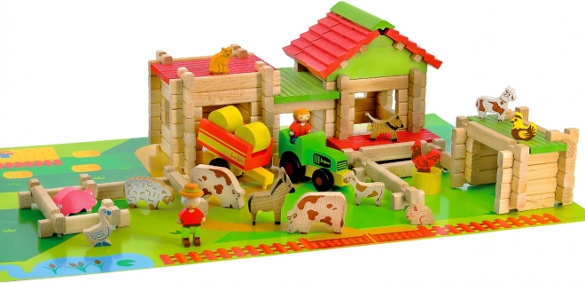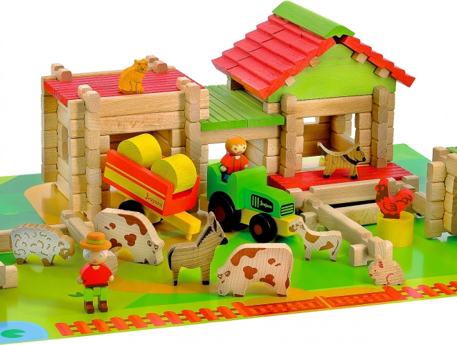 Dette byggesæt understøtter børns kreativitet og lader dem skabe deres egen gård med rødt tag, grøn traktor og masser af dyr.