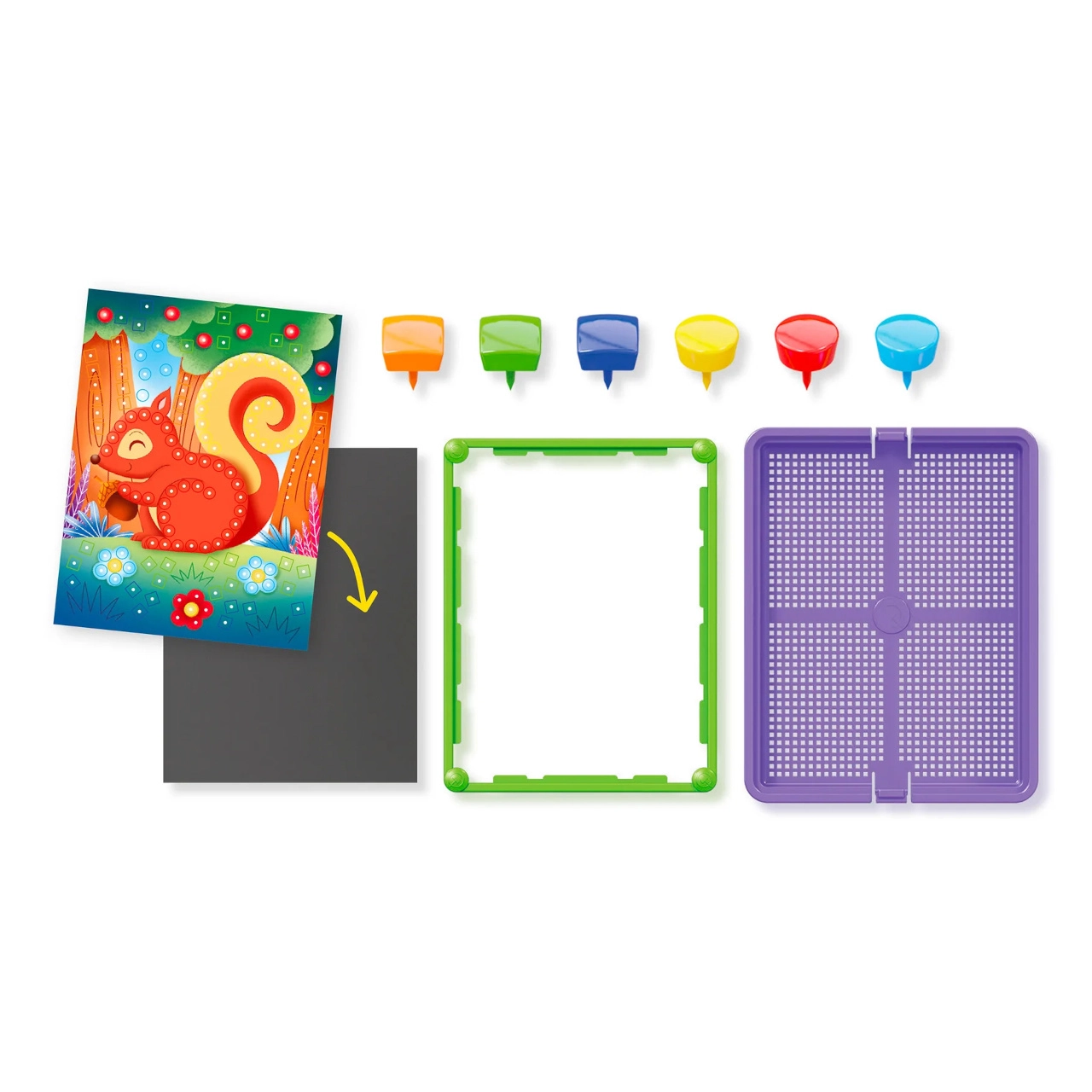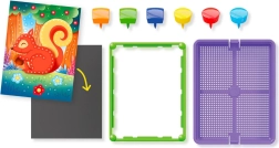 Denne farverige pindenålsmosaik fanger børns interesse ved at lade dem skabe billeder ud fra de forberedte kort eller deres egne designs. Med den intuitive indsætning af pinde i pladen træner børn greb, tålmodighed og visuel perception. De robuste plastdele og rammen giver stabilitet og nem transport.
