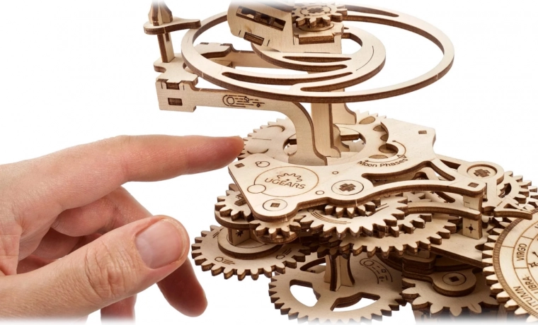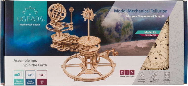UGEARS Tellurium er en smuk 3D træmekanisk model, der bringer principperne fra Kopernikus’ system i dine hænder. Med et manuelt håndtag sætter du et gearsystem i gang, som i præcis skala viser Jordens rotation, Månens omløb og bevægelsen omkring Solen, inklusive hældningen af Jordens akse og Månens rotationsplan.