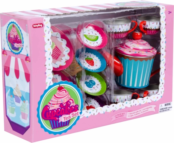 Hele sættet er designet med lyse farver og dekorerede muffinmotiver, hvilket gør det til det perfekte valg til imaginære teselskaber.
