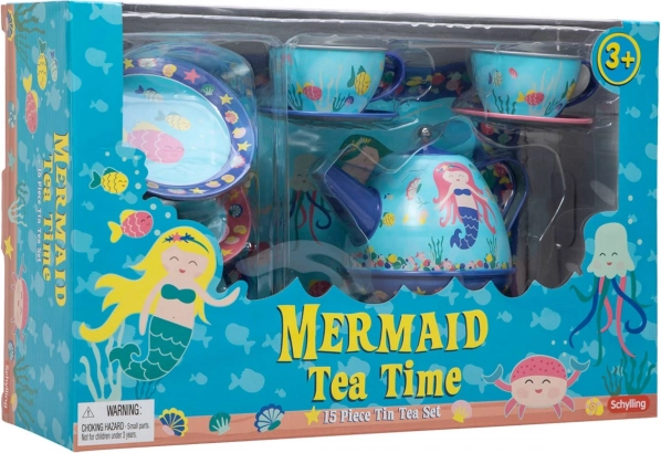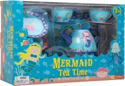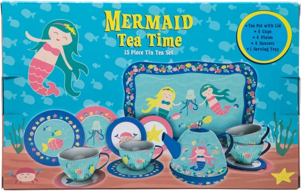 Når det er tid til te, er der intet bedre valg end dette vidunderlige metalsæt. Kreativiteten blomstrer, når dine børn byder venner, dukker og bamser på te med dette flotte sæt. Sættet indeholder 4 kopper med underkopper, 4 desserttallerkener, en tekande med låg og et serveringsfad – alt i havfruedesign.