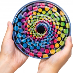 Nyd klog leg hvor som helst og når som helst. Denne runde labyrint med stålkugle tilbyder tre dragende motiver – sort-hvid spiral, rød-gul hvirvel og en farverig “regnbue”. Vip blot spillet let og navigér kuglen gennem de snørklede stier ind til midten. Et godt valg til rejser, venteværelser og pauser.