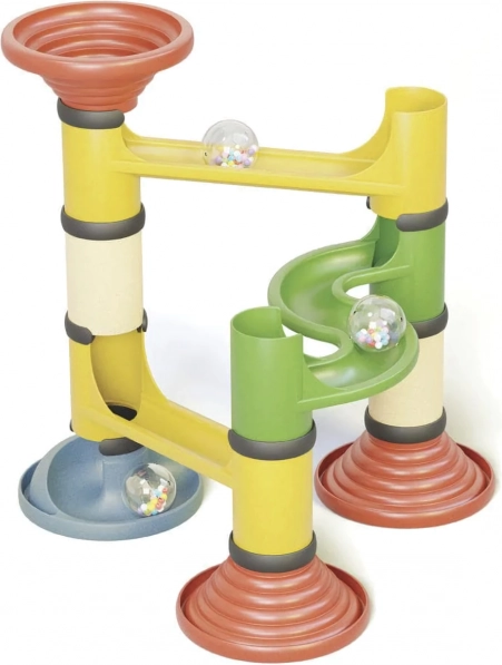 Med dette unikke byggesæt kan børn hurtigt og intuitivt bygge forskellige kuglebaner takket være den nemme sammenkobling. Alle dele er lavet af innovativ bioplast, der kombinerer træfibre og plastik. Dette miljøvenlige valg reducerer CO2-udslip betydeligt under produktionen, og materialerne er 100% genanvendelige. Legetøjet ser ikke kun ud og dufter som træ, men er også holdbart og behageligt at røre ved.
