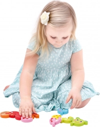 Det holdbare design i massivt træ og de mættede, ugiftige farver sikrer lang levetid og sikker leg. Brikkerne er store nok og lette at holde for små hænder, så selv begyndere kan være med.