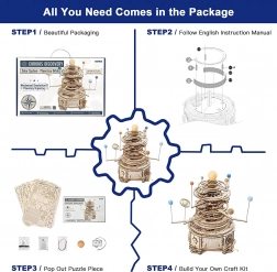 Oplev universets magi med denne præcise 3D-model af et mekanisk solsystem-ur. Byg en fungerende træ-orrery med hånddrev, hvor planeterne kredser i forskellige hastigheder, og LED-solen lyser. Modellen i laserskåret krydsfiner tilbyder en interaktiv mekanisme, en lærerig oplevelse og en stilfuld dekoration i ét.