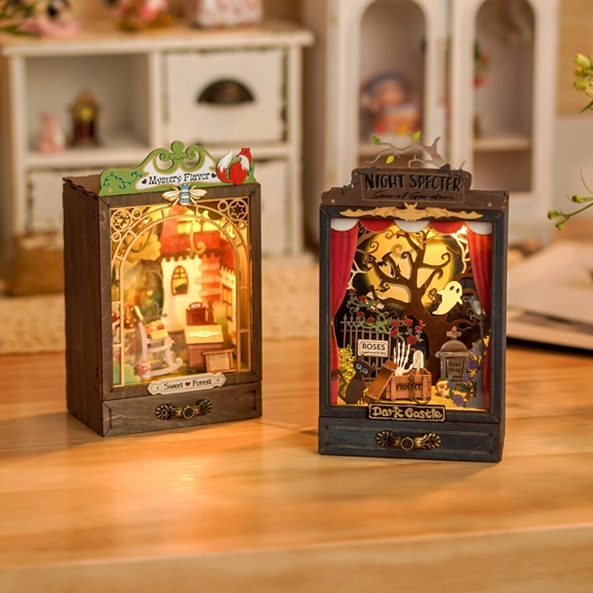 Forbered din scene og opfør magiske forestillinger i kabinetdioramaer. Dette miniature teater er udstyret med varmt LED-lys, der fremhæver dybde og atmosfære i din scene. Skjulte glidende paneler af klar plast beskytter din dekoration mod støv.
