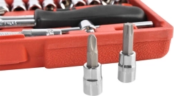 Sættet leveres i en robust kuffert, hvor hvert værktøj har sin specifikke plads. Dette letter organisering og transport, og ingen værktøjer bliver væk.