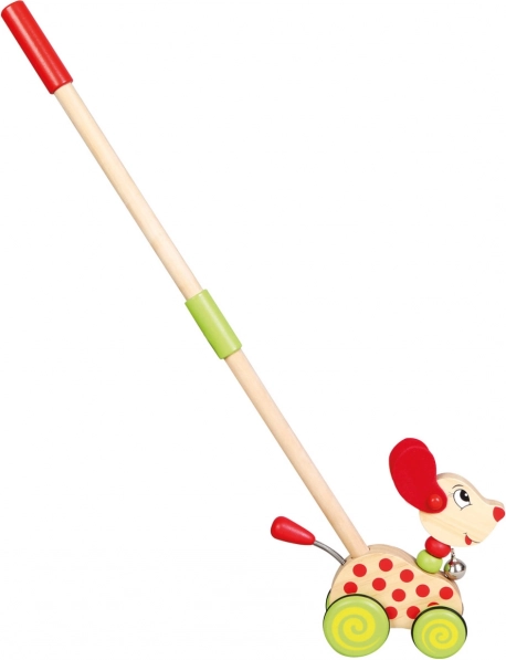 Den træbaserede skubbehund på pind fra Bino er et populært aktivitetslegetøj, der motiverer børn til at gå og bevæge sig aktivt. Når hunden skubbes foran barnet, ringer den blidt med klokken, hvilket underholder og opmuntrer til flere skridt. De gummibelagte hjul sikrer en jævn og stille kørsel på forskellige underlag.