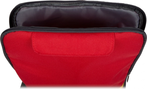Rygsækken i rød-gult design har dobbeltlynlås for hurtig åbning, justerbare skulderstropper for behagelig bæring og to spænder til fastgørelse af tilbehør. Træ- og plastkomponenterne ligger godt i hånden og tåler intens leg.
