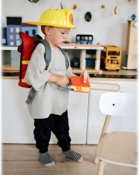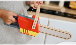 Denne kvalitets træmotorsav til børn kombinerer robust udførelse og sikkert design til daglig leg. De markante røde og gule elementer med den realistiske savform stimulerer fantasien og styrker rolleleg og finmotorik.